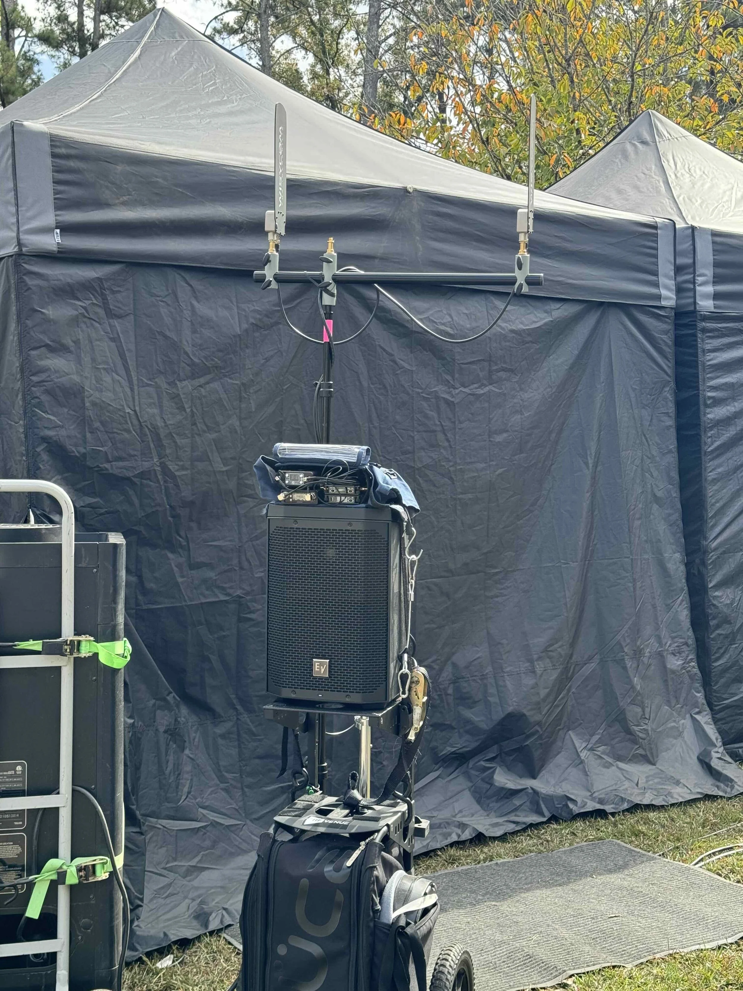 A perfect example occurred recently on a shared stage with two units filming simultaneously. While the wall between us was acoustically treated, the electromagnetic waves could easily travel through; we were close enough that the two zones easily picked up each other's frequencies.